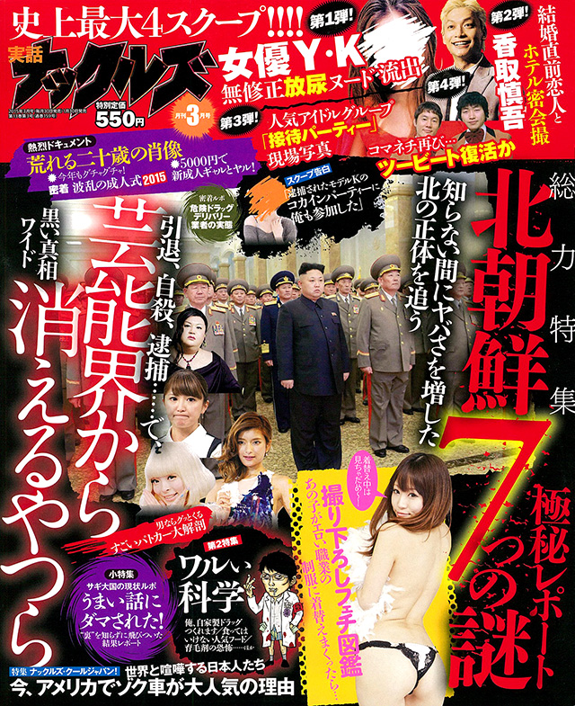 ◎ニッポンが北朝鮮をターゲットに◎俺は北朝鮮強盗団の襲撃現場を見た◎北マフィアVS半グレ 恐怖のシノギ戦争◎あのロッドマンが出禁に◎セレブのお笑い流行通信2015◎直撃インタビュー“金正日の料理人”藤本健二「北朝鮮怖い噂の真相」◎北朝鮮に日本人村があった◎フルチン密輸の現場撮った◎脱北者の隠れ家に潜入